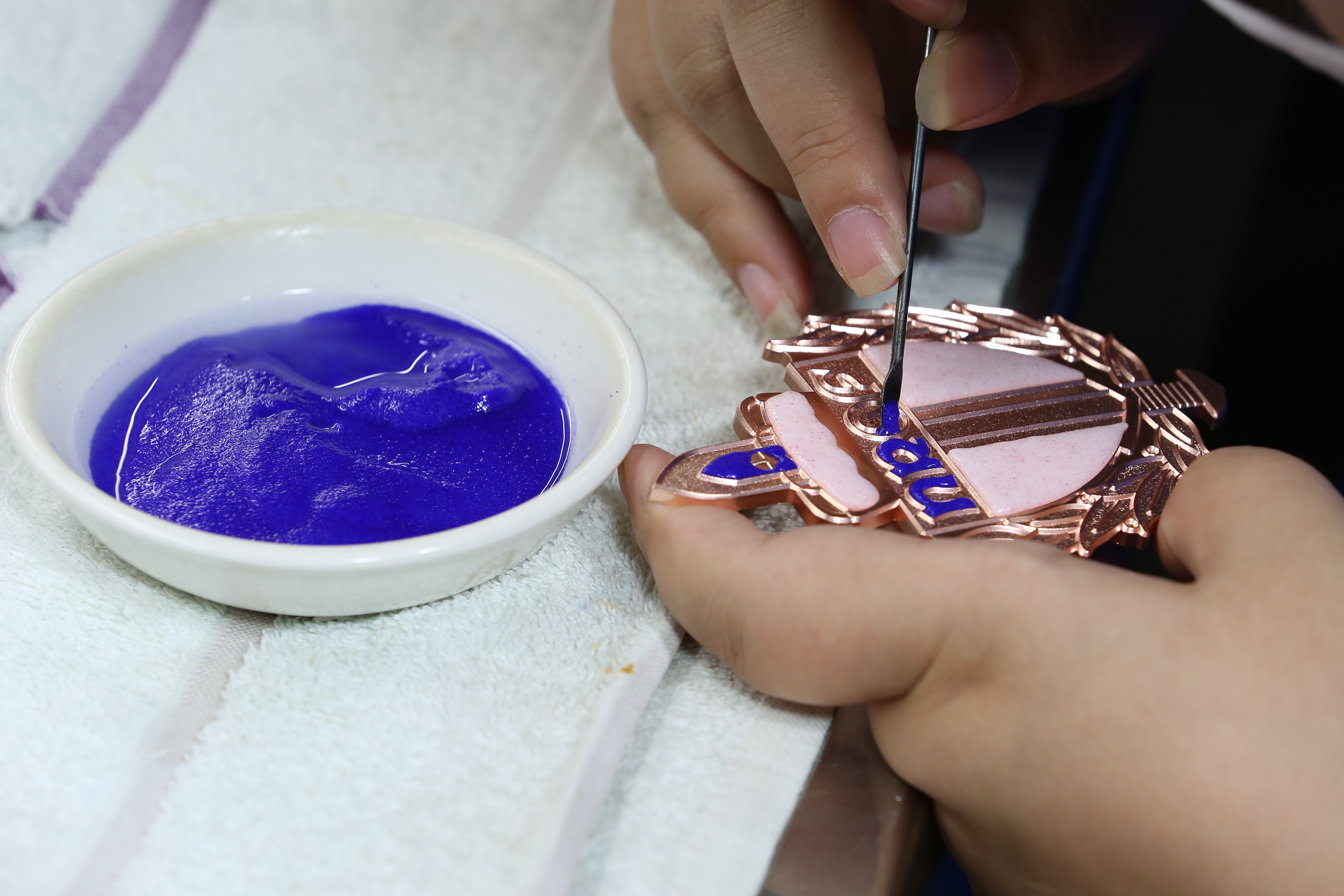 琺瑯徽章的制作流程:制圖——曬版——咬模版——刻模——切模——壓沖——上色——高溫?zé)?mdash;—磨石——修補(bǔ)——拋光——焊配件——電鍍——品檢——包裝